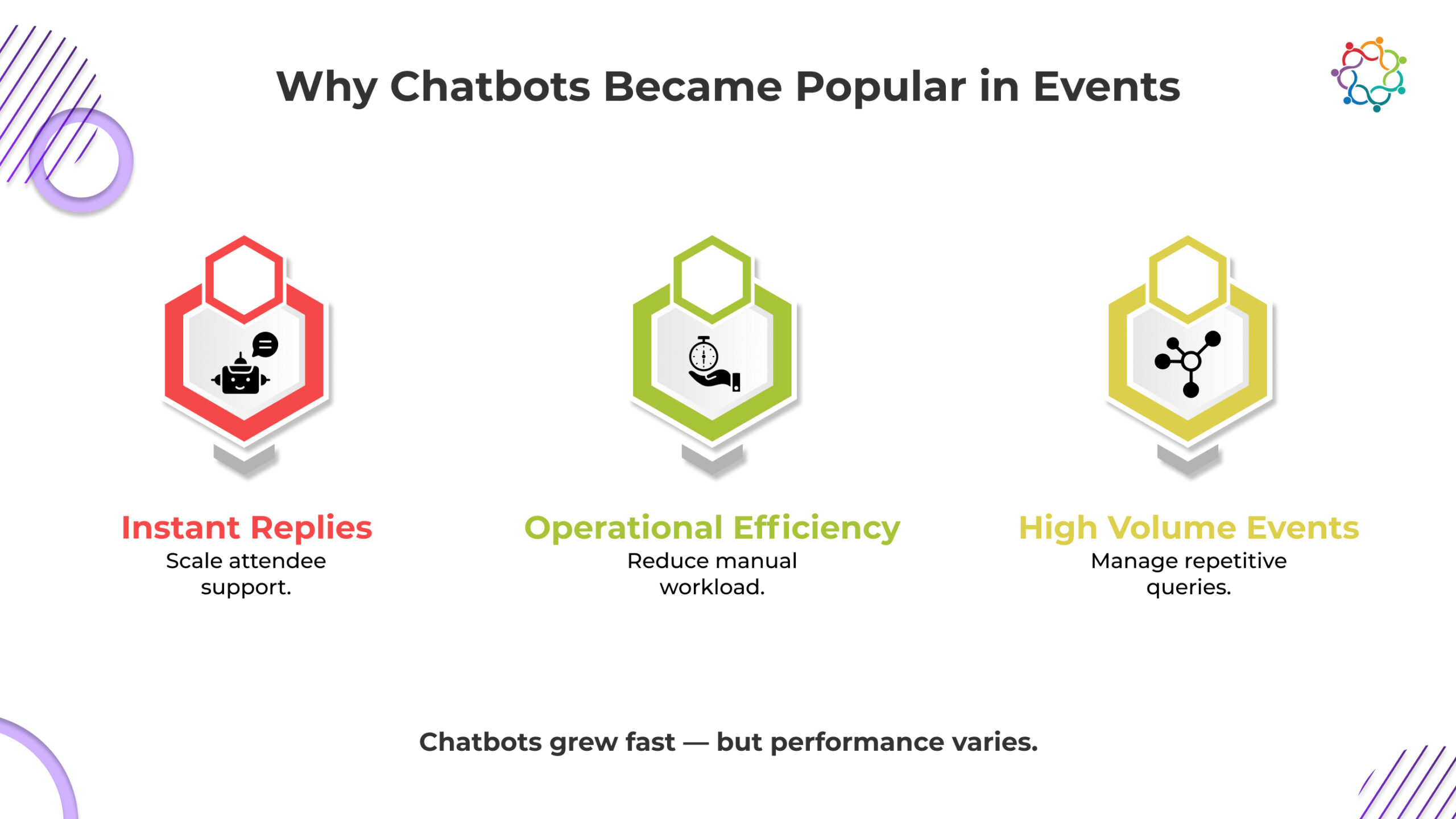 AI chatbots experienced growing popularity in the event industry as event teams have been looking for scalable ways to approach attendee communication. These chatbots promised instant answers, real-time assistance, and reduced need for staff. As events continued to grow larger and more complex, chatbots appeared to be a great way to facilitate high volume questions from attendees as teams learned to scale without burdening their human teams.
