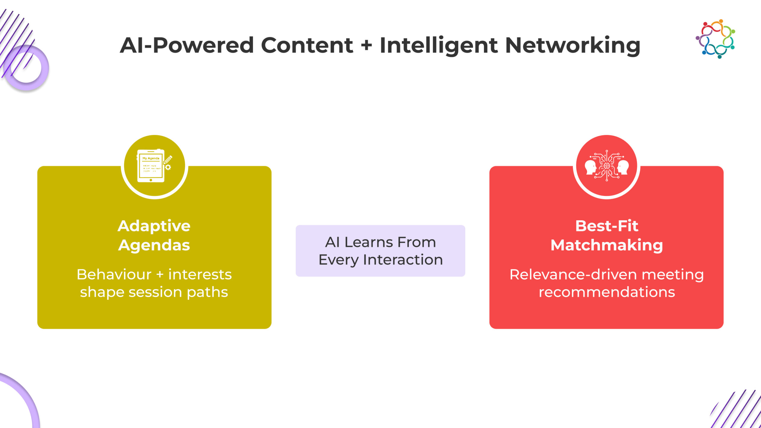 As attendees interact with different sessions, including viewing content and visiting displays booths, and saving sessions for future viewing, AI can immediately adapt its relevant recommendations based on previous behaviour. The event experience is fluid and continuously evolving.
