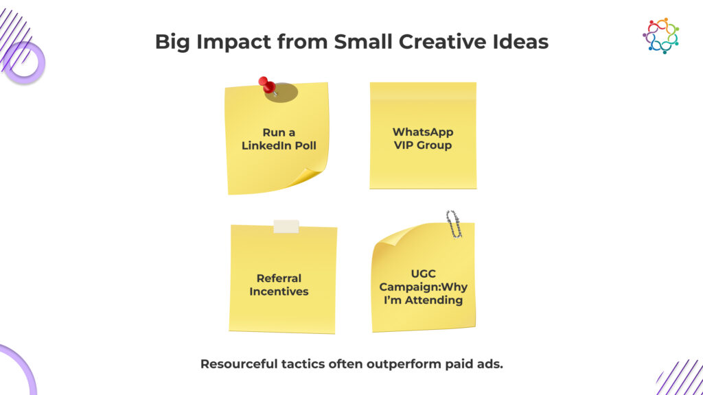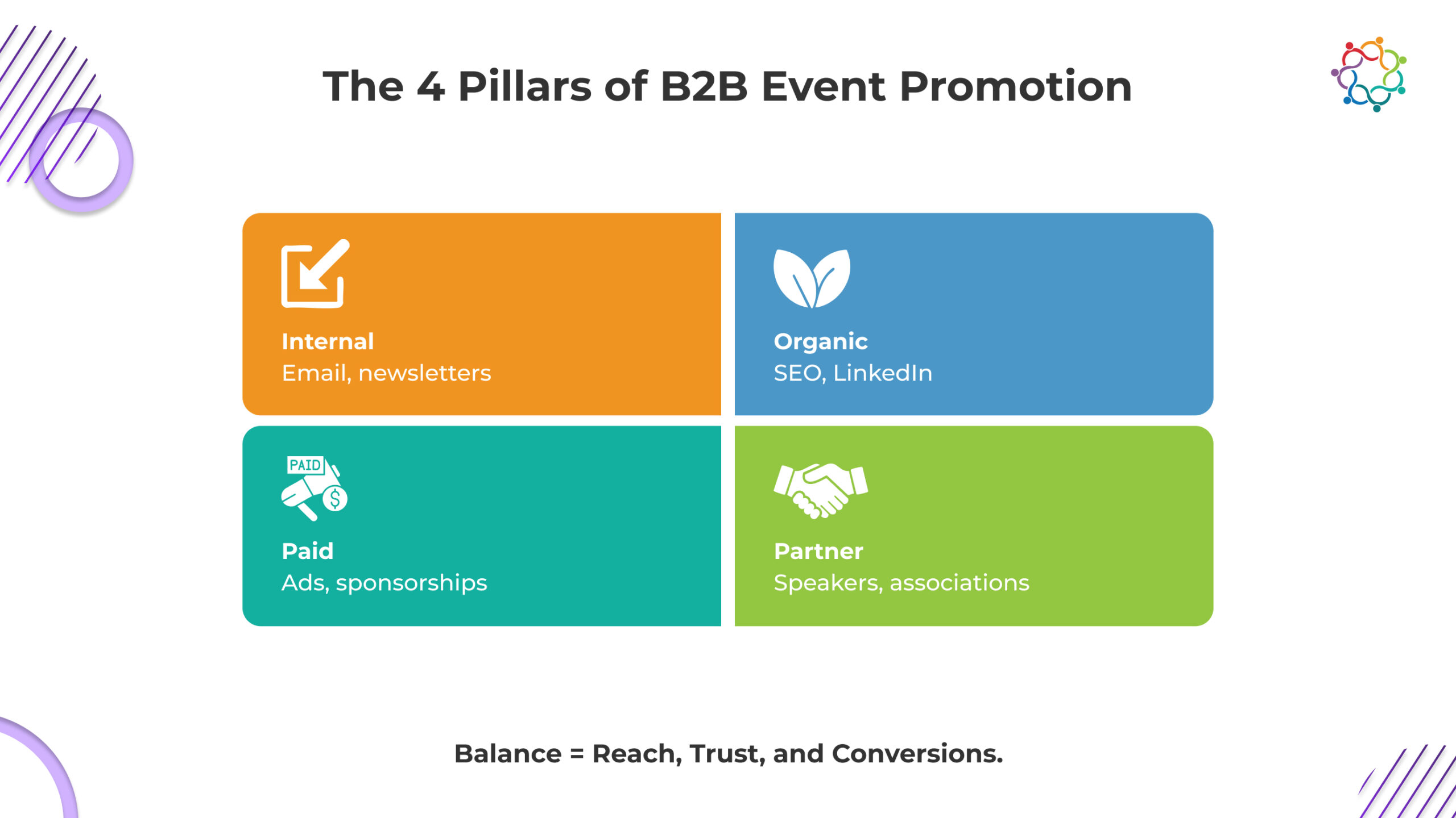 An effective B2B event promotion strategy involves a multi-channel mix that balances reach, trust, and conversion power. Internal channels are the foundation, organic channels add credence, paid campaigns increase reach, and partner programs offer a third-party validation. When combined in a multi-channel event promotion strategy, these 4 components offer a maximized ROI while ensuring no audience segments are left behind.