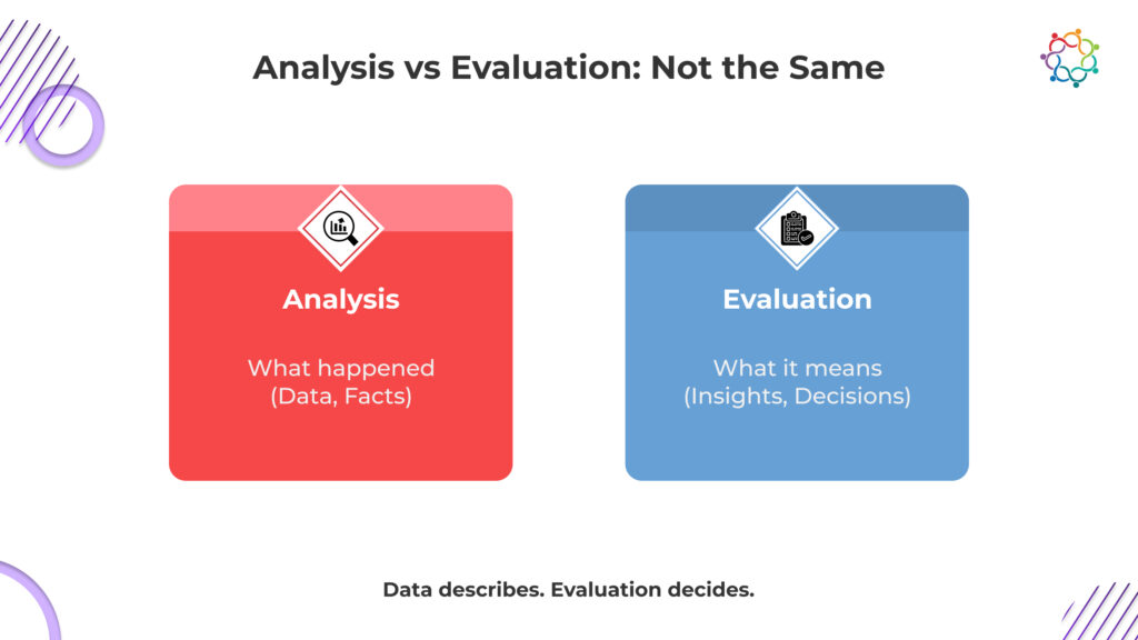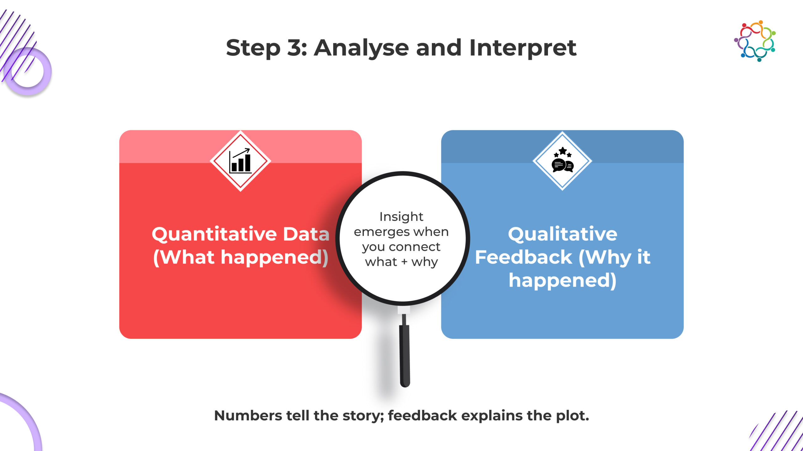 This is where the process changes from collecting data to interpreting findings. Numbers without context can be misleading and stories without data can lead to bias in decision making. The most effective analysis combines quant and qual.
