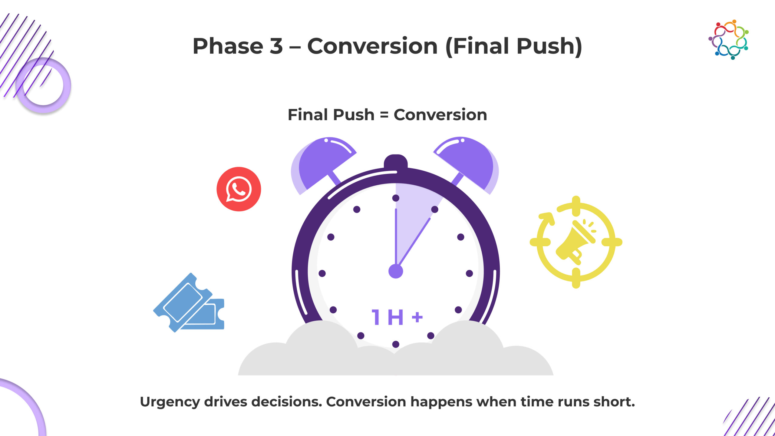 This is where urgency will serve you best, the Conversion Phase is all about taking engaged prospects and converting them into confirmed attendees.