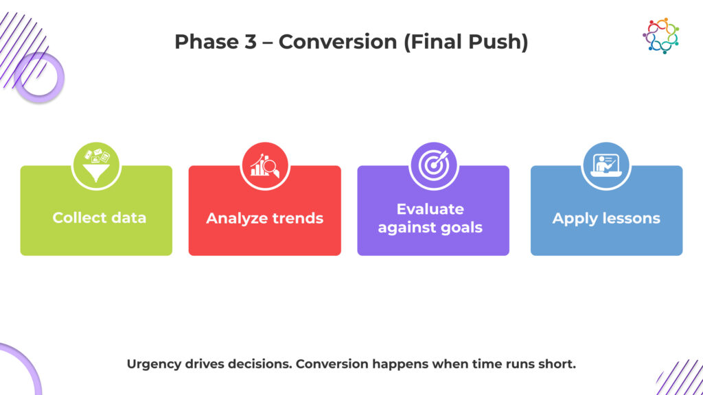 Engaged audiences will procrastinate. So, a final push may be just what it takes to ensure they don’t wait until it is too late. The Conversion Phase helps give your audiences something that helps differentiate between “interest” and commitment.