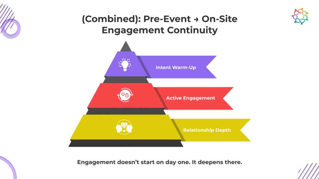 Pre-event indicators assess readiness and audience quality. Intent data, registration composition, and account alignment signal whether an event is likely to perform. During the event, engagement depth matters more than raw attendance. Session participation, meaningful conversations, and meeting quality provide real-time feedback.