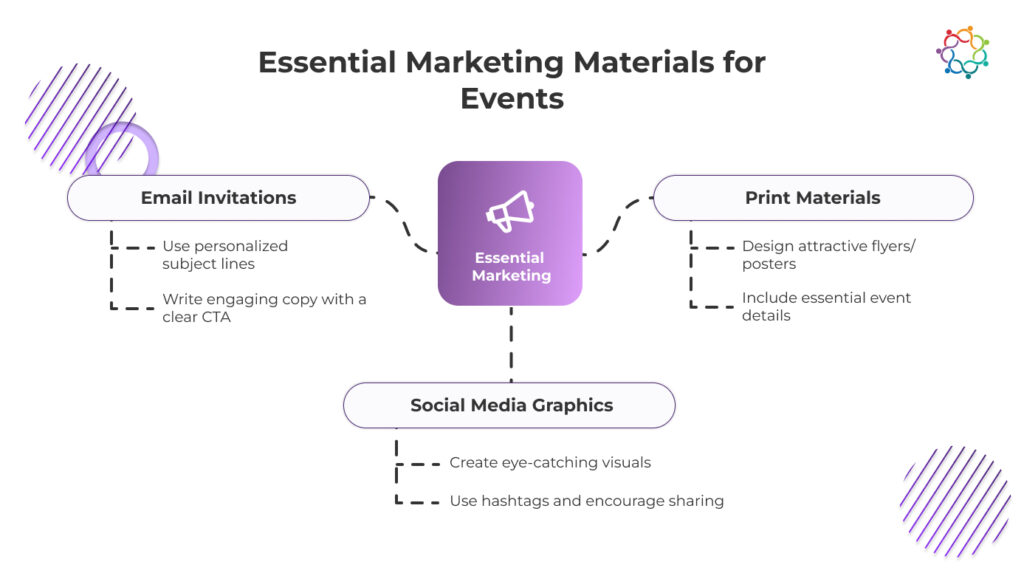 Infographics: Use visuals as an effective means of conveying key data, event schedule, attendee demographics, etc.