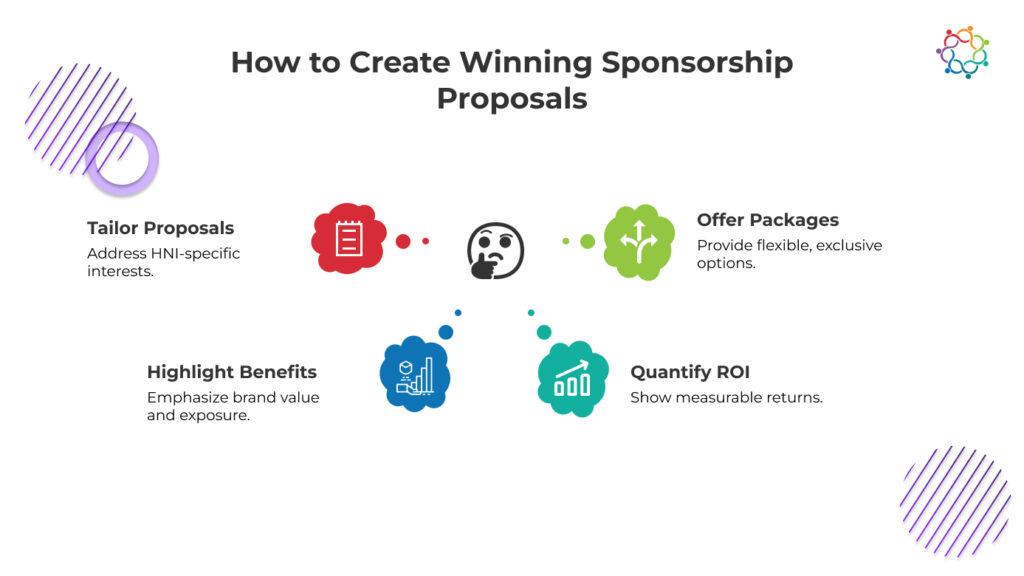 Should an HNI be convinced to sponsor an event, they will need to present a sponsorship proposal to their board of directors, or other approval committees. Good sponsorship proposals, proposals that present all necessary materials in the appropriate way proves to be important to engaging HNIs as sponsors.