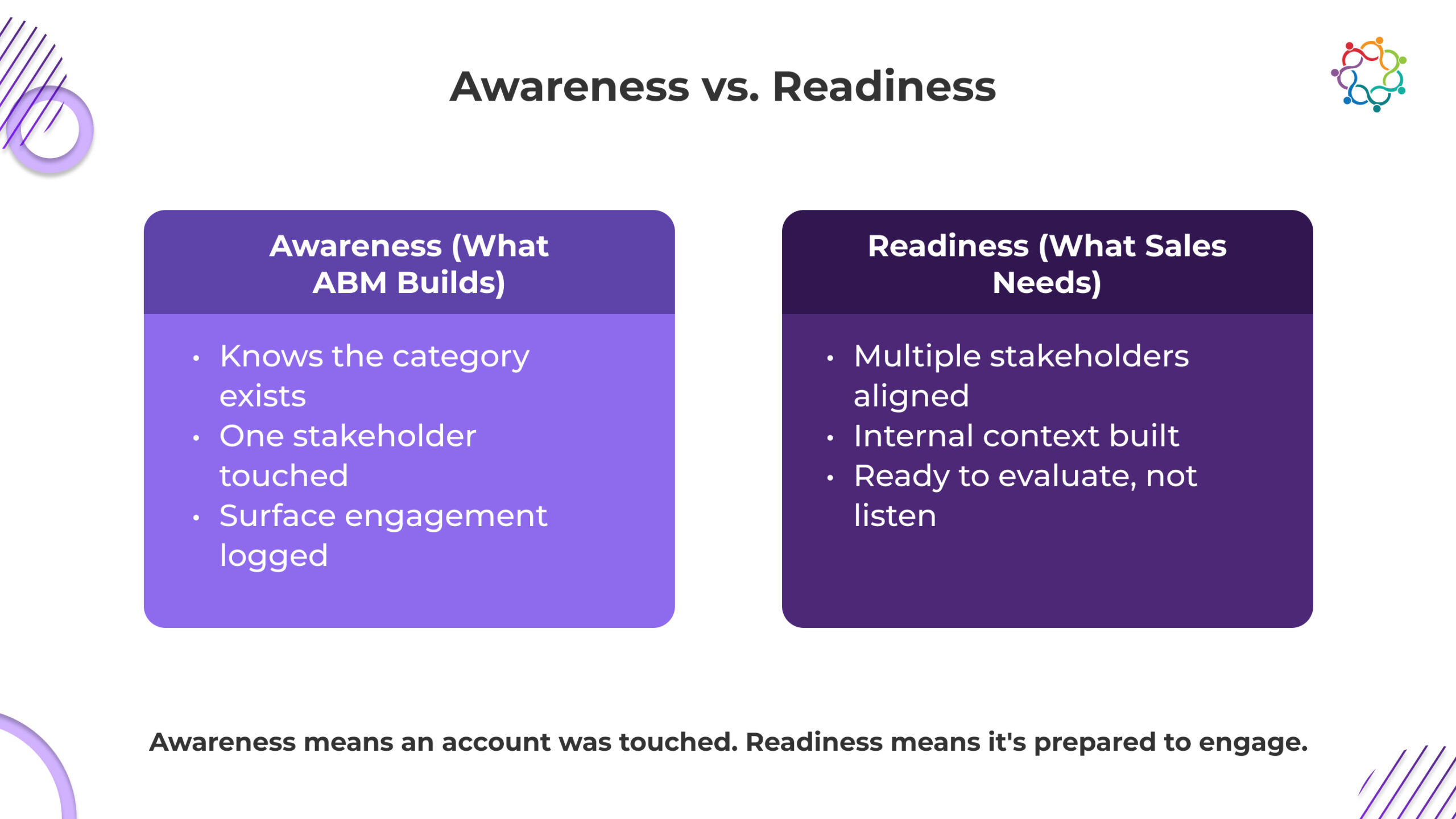 An account is aware when it knows your category exists. An account is ready when its buying group has built enough shared context to evaluate a vendor rather than just inquire about one. The gap between those two states is wide, and outreach alone cannot close it.