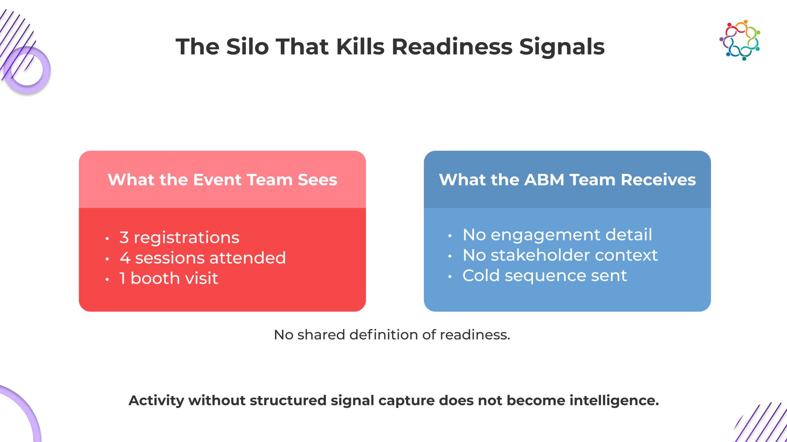 The root cause is not poor execution. It is the absence of a shared system for capturing and routing event signals. Events generate readiness signals continuously, but signals without structured capture do not become intelligence. They become noise. And when ABM teams cannot see what events are producing at the account level, they keep treating events as a separate channel rather than the conditioning layer that the entire motion depends on.