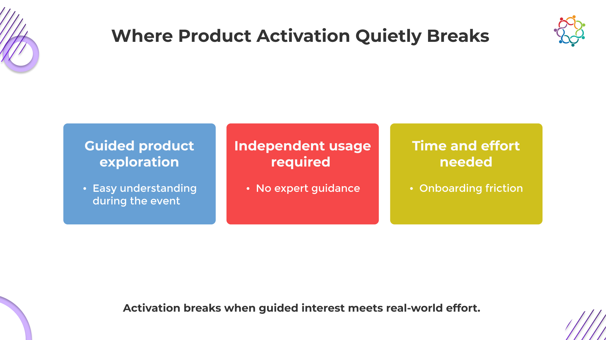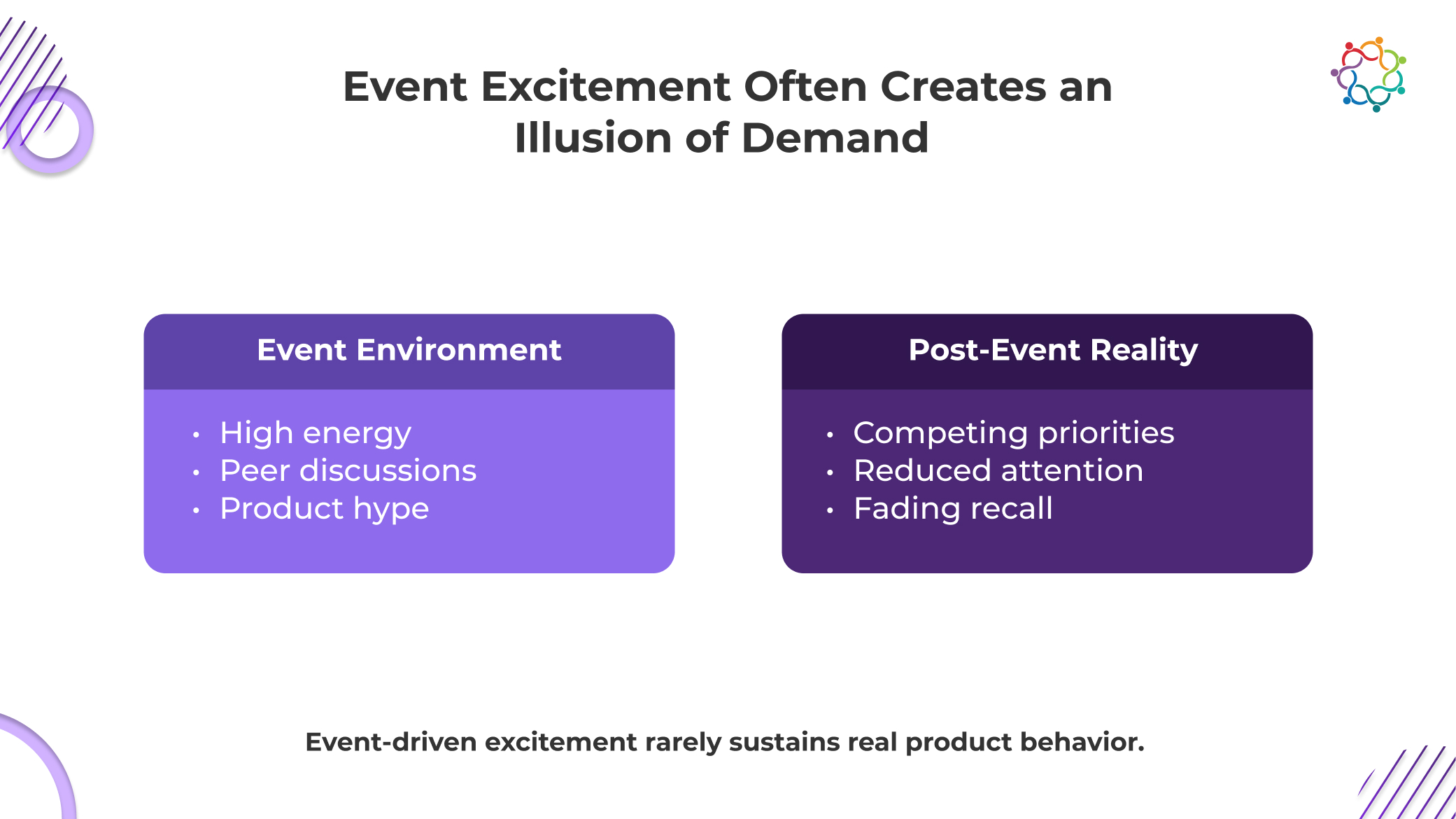 events drive visibility, but without sustained validation and alignment, interest rarely converts into actual product usage.