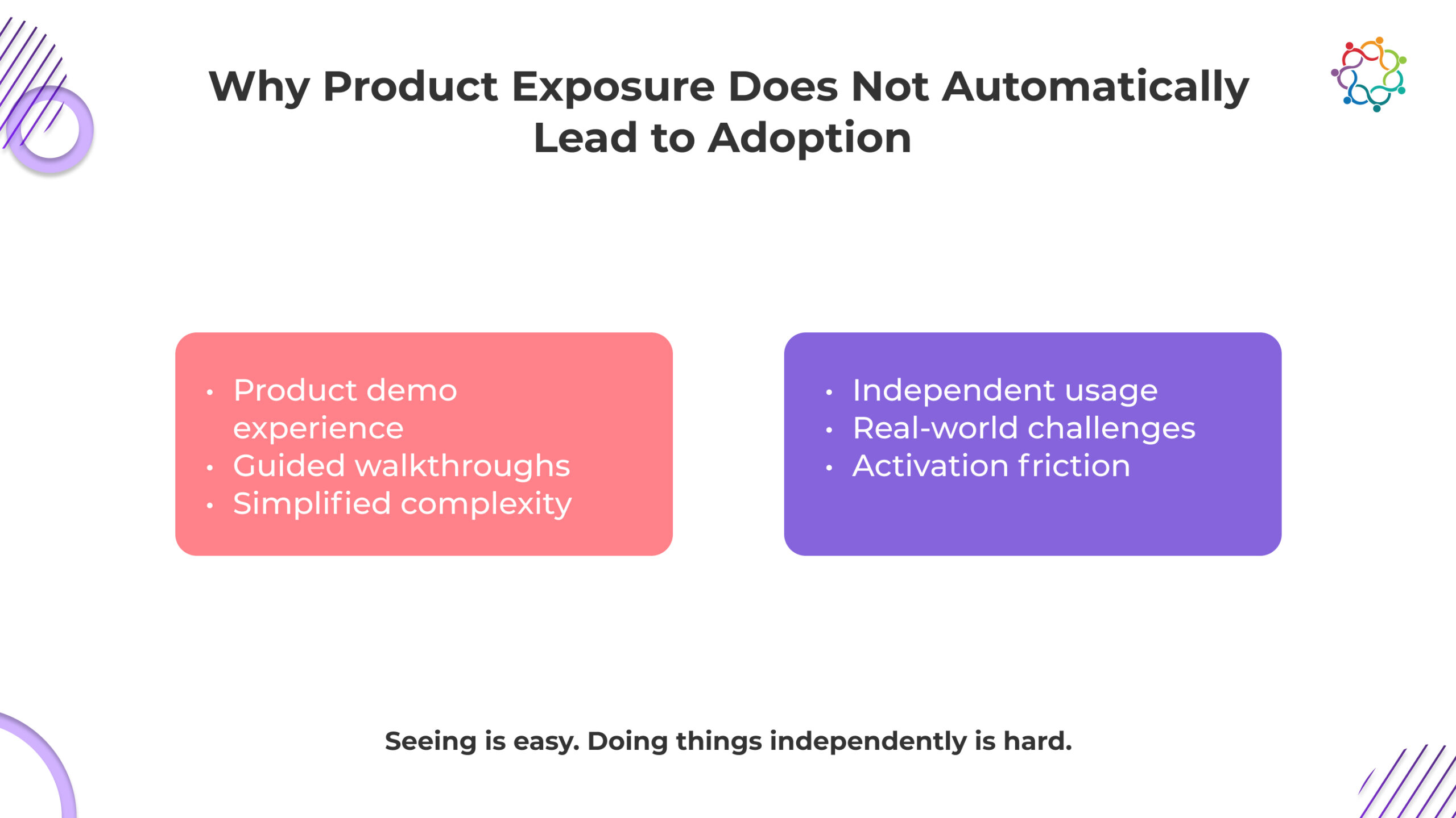 Users deal with the product on their own, experience friction in the process, and find it difficult to duplicate what appeared simple during the demonstration. Exposure is a passive process. Adoption is in progress. Users are unprepared for real-world usage when events are created for visibility. This is not a short-term deficit; it is a fundamental issue.