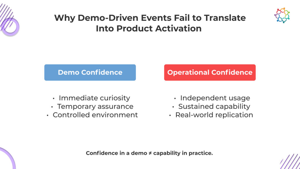 The problem is structural. Events optimize for attention, not adoption. Awareness alone cannot create behavioral change. Adoption requires independent product usage, confidence, and a commitment to integrate a tool into existing workflows. In controlled demo environments, users can follow scripted flows, guided steps, and supportive facilitators. Outside the event, these crutches disappear. Users struggle to replicate what seemed intuitive during the demo.