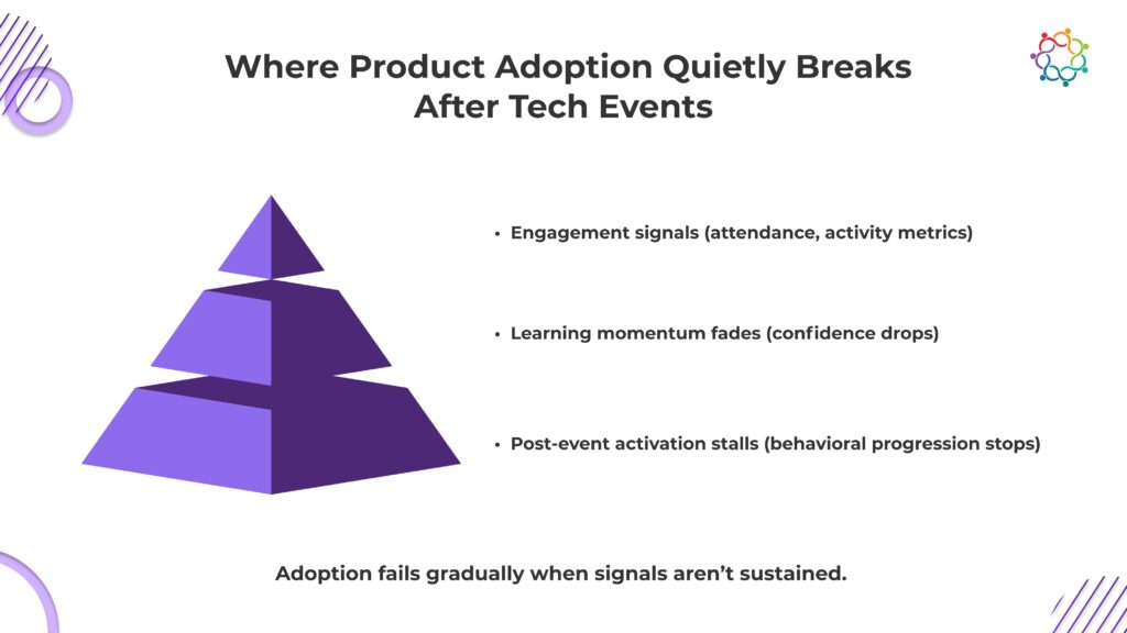 Adoption does not fail dramatically. It erodes quietly. Post-event, the signals that could sustain momentum are often absent, creating multiple friction points: