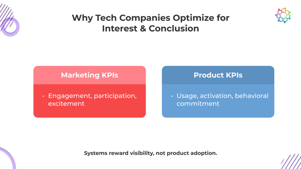 Product teams are measured on activation, usage depth, and retention. These outcomes develop slowly and often outside the event environment. They require sustained behavioral change, not momentary enthusiasm.
