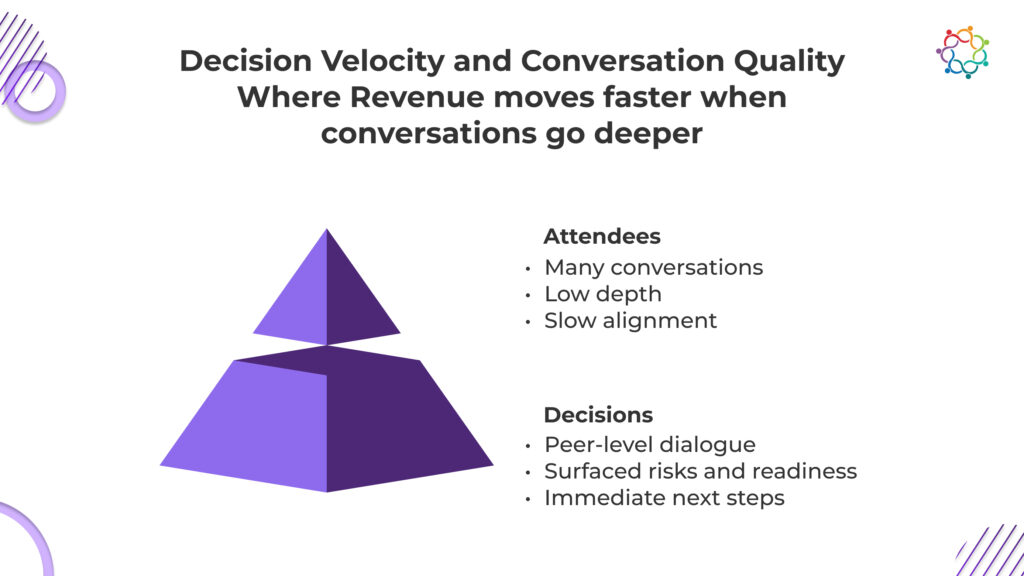 Attendance volume does not indicate commercial impact. Decision velocity does. The true question is whether the event shortens time-to-decision inside active accounts. When evaluated through this lens, smaller rooms frequently outperform larger conferences.