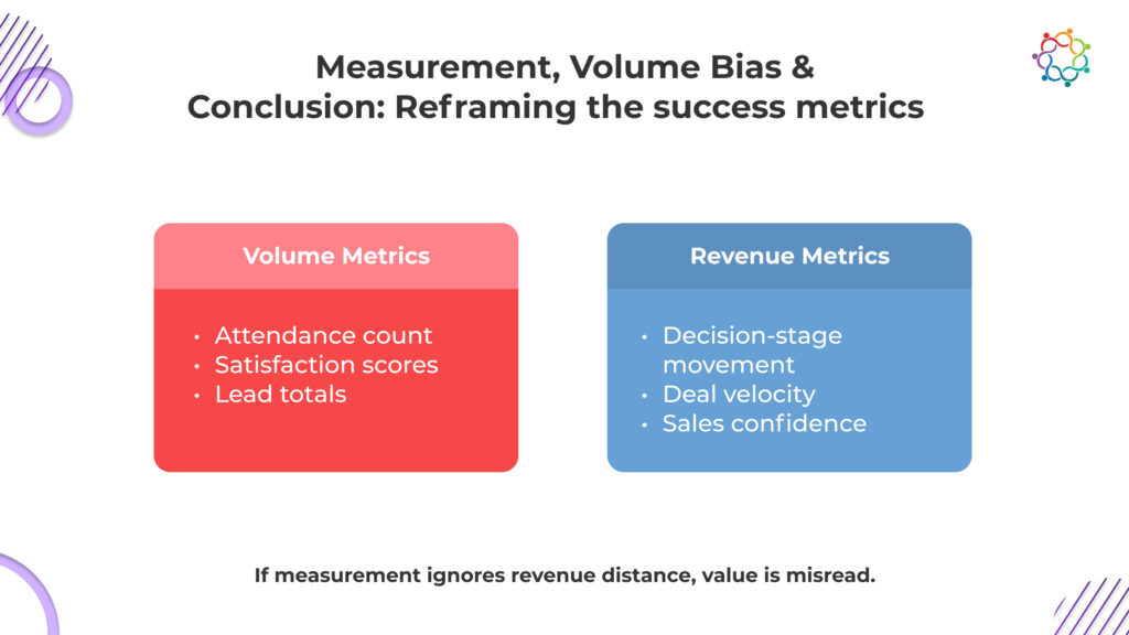 Attendance volume, satisfaction scores, and lead quantity belong to conference dashboards. They do not measure buying committee alignment or shifts in deal velocity. Applying these metrics protects optics while hiding commercial reality. The format appears successful even as the revenue impact weakens.