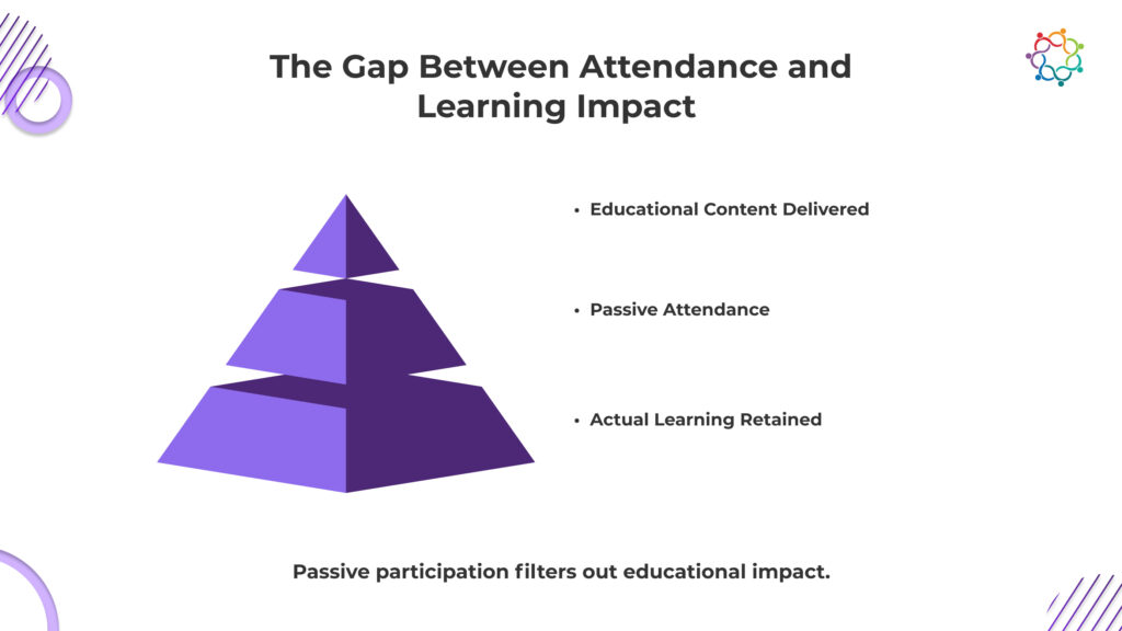 Organizations can confirm who attended. They cannot confirm who actively learned. They can document session completion. They cannot prove knowledge absorption or educational influence.