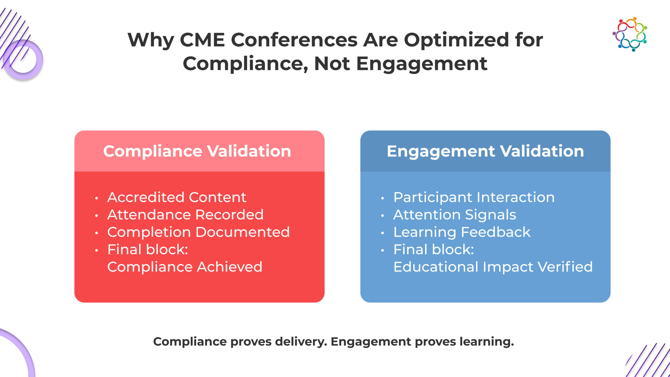 This structure serves an essential purpose. It protects trust in continuing medical education events. But compliance frameworks were never designed to measure engagement.