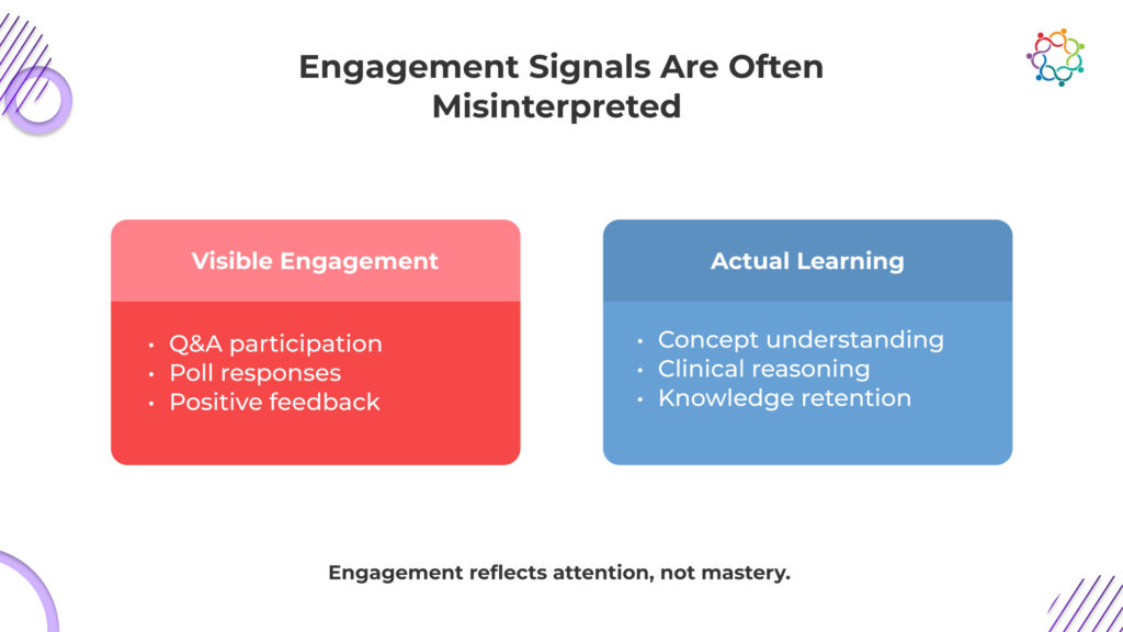 A physician can participate without processing the content deeply. They can respond to a poll instinctively, ask a question out of curiosity, or rate a session highly because the speaker was engaging. None of these actions confirms that knowledge was absorbed or retained.