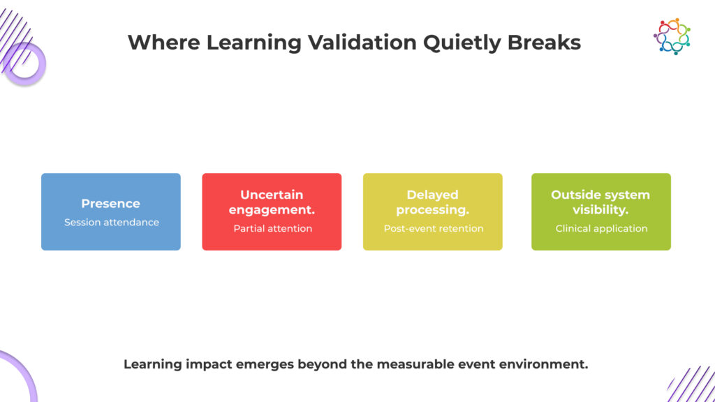 This is where validation breaks down. Even if learning occurs, it cannot be confidently linked back to the session. Attribution is lost. The system cannot prove whether a clinical decision was influenced by the event, prior knowledge, or another source.