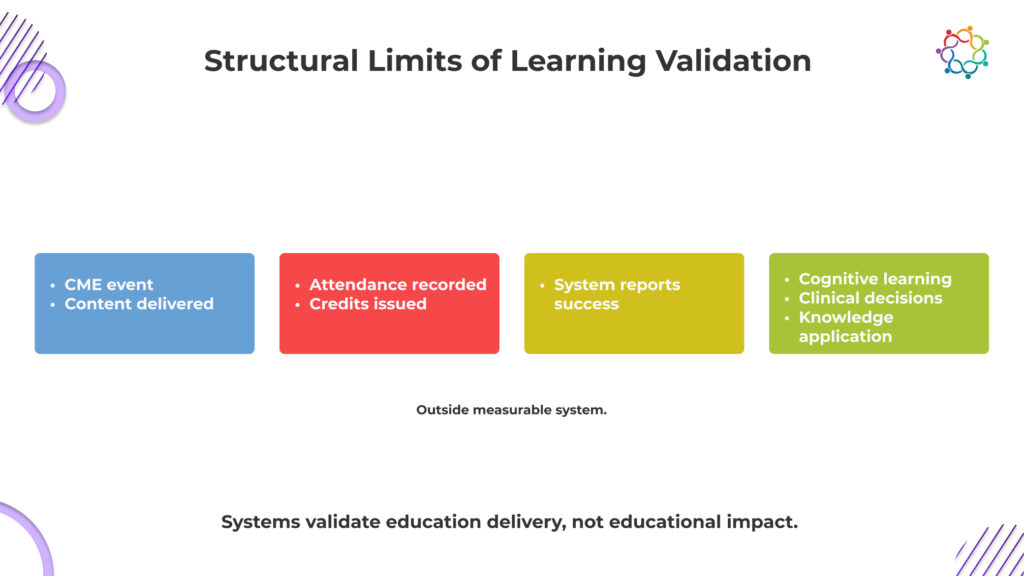 A physician can attend multiple sessions, earn credits, and still show minimal change in clinical understanding. The system records success, even when learning is uncertain.