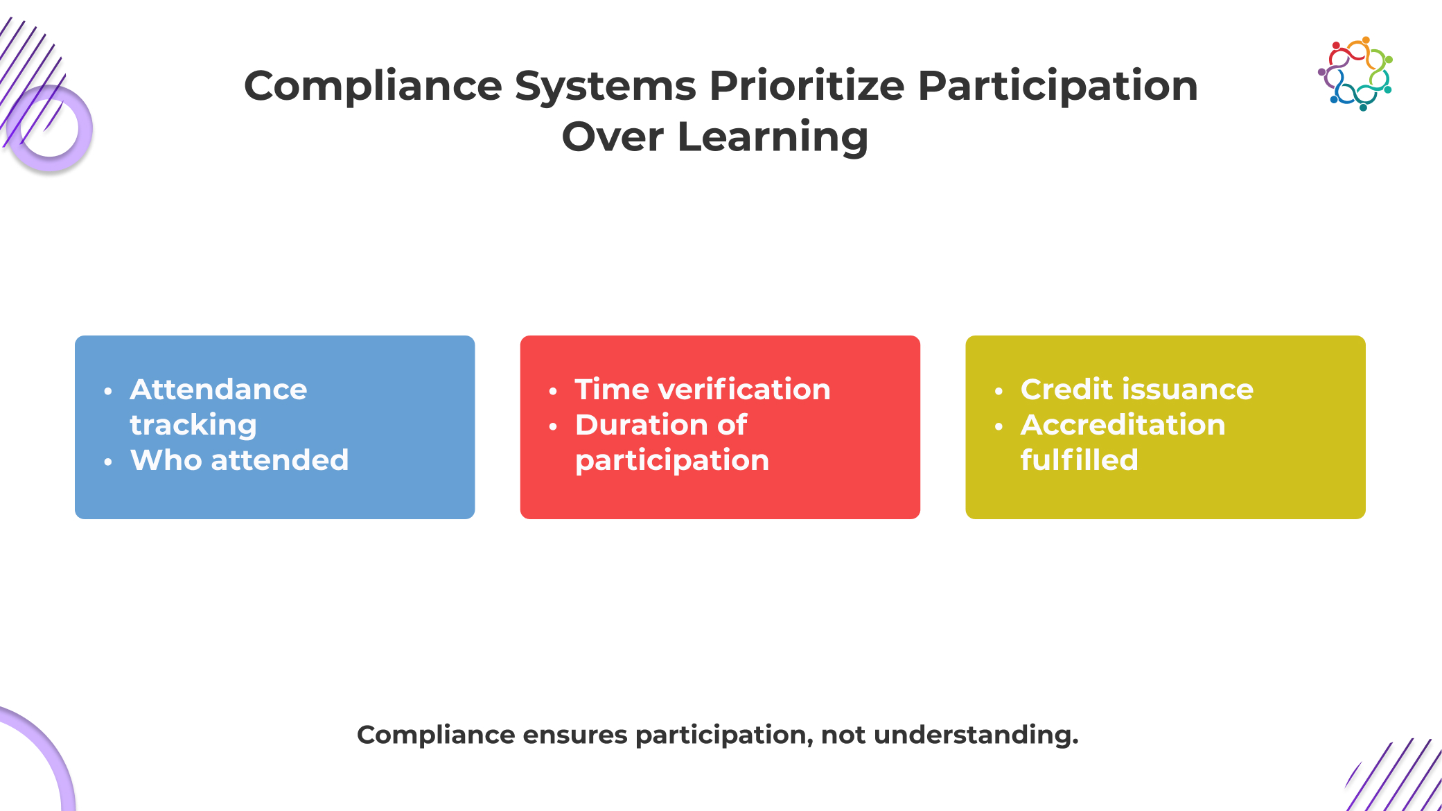 At their core, these frameworks exist to prove compliance. They ensure that educational standards are met, content is accredited, and physician participation is properly documented. Everything revolves around what can be verified in an audit.