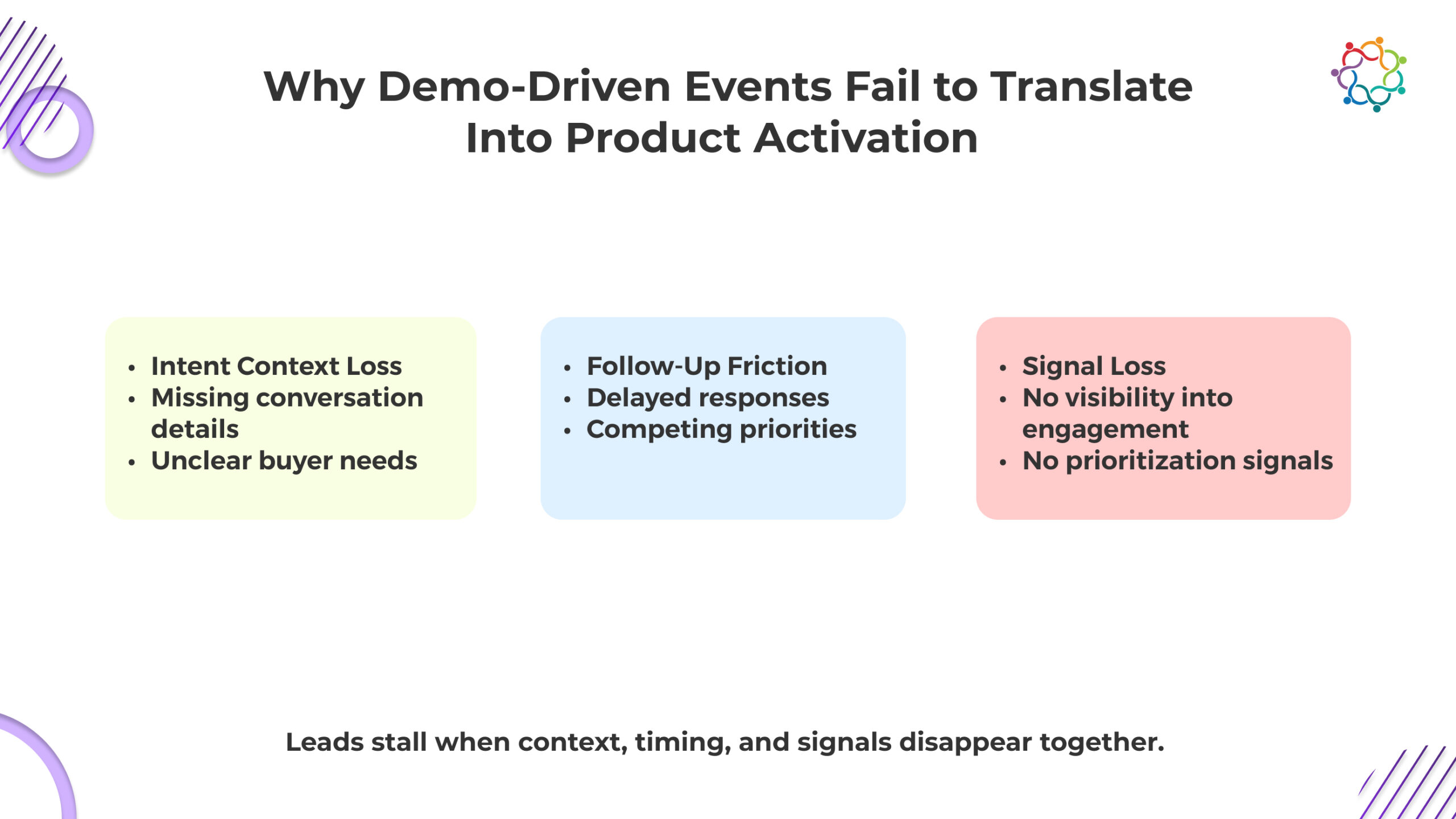 No context, weak follow-up, distracted buyers, missing signals. The outcome is inevitable. Conversations fade, opportunities never form, and what looked like momentum collapses before entering the pipeline.