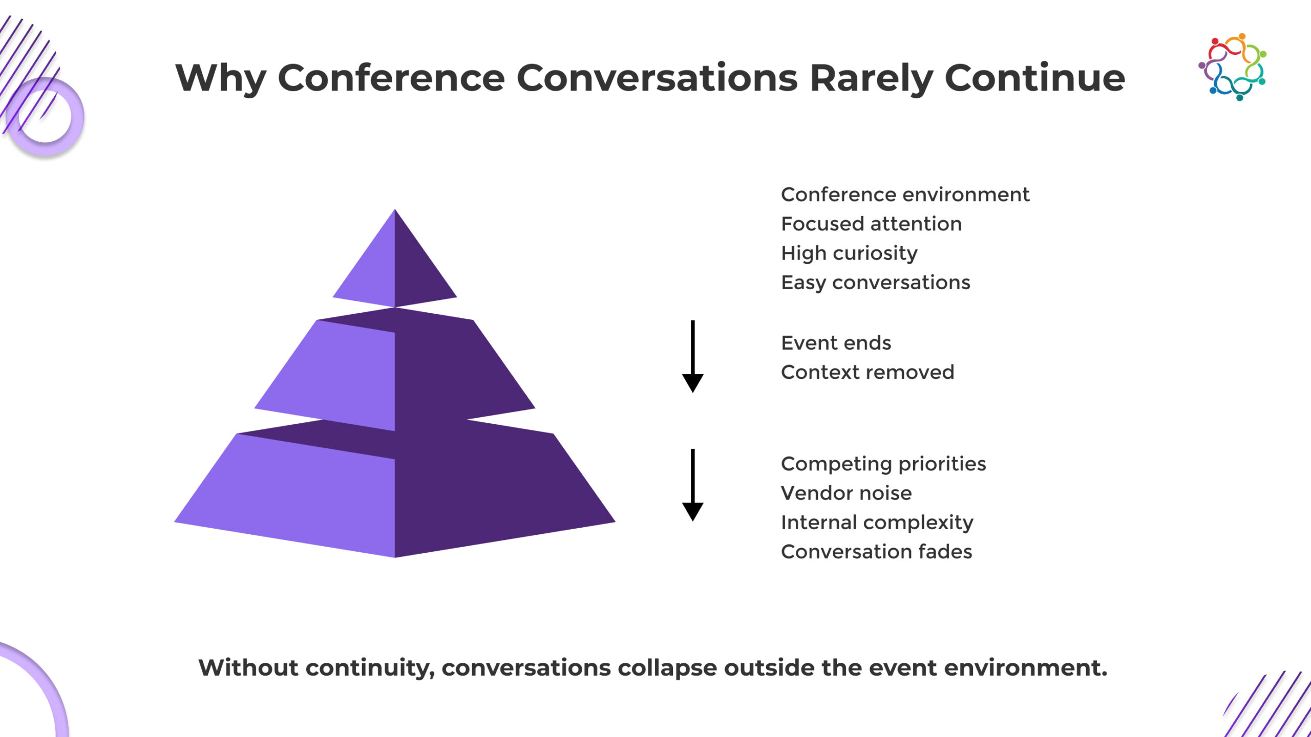 But that expectation is built on a flawed assumption. Activity during the event does not equal continuity after it. The environment disappears the moment the conference ends, leaving fragmented interactions with no guaranteed progression.