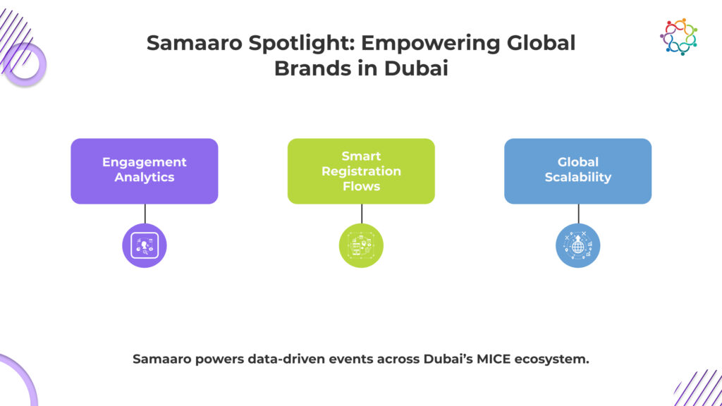 Dubai’s new event economy runs on data, personalisation, and operational scale, exactly where most organisations struggle when running high-stakes corporate events in the region. Samaaro addresses that gap by giving enterprise teams one platform to manage registration intelligence, behavioural analytics, personalised agenda delivery, lead qualification, and post-event ROI without relying on fragmented tools.