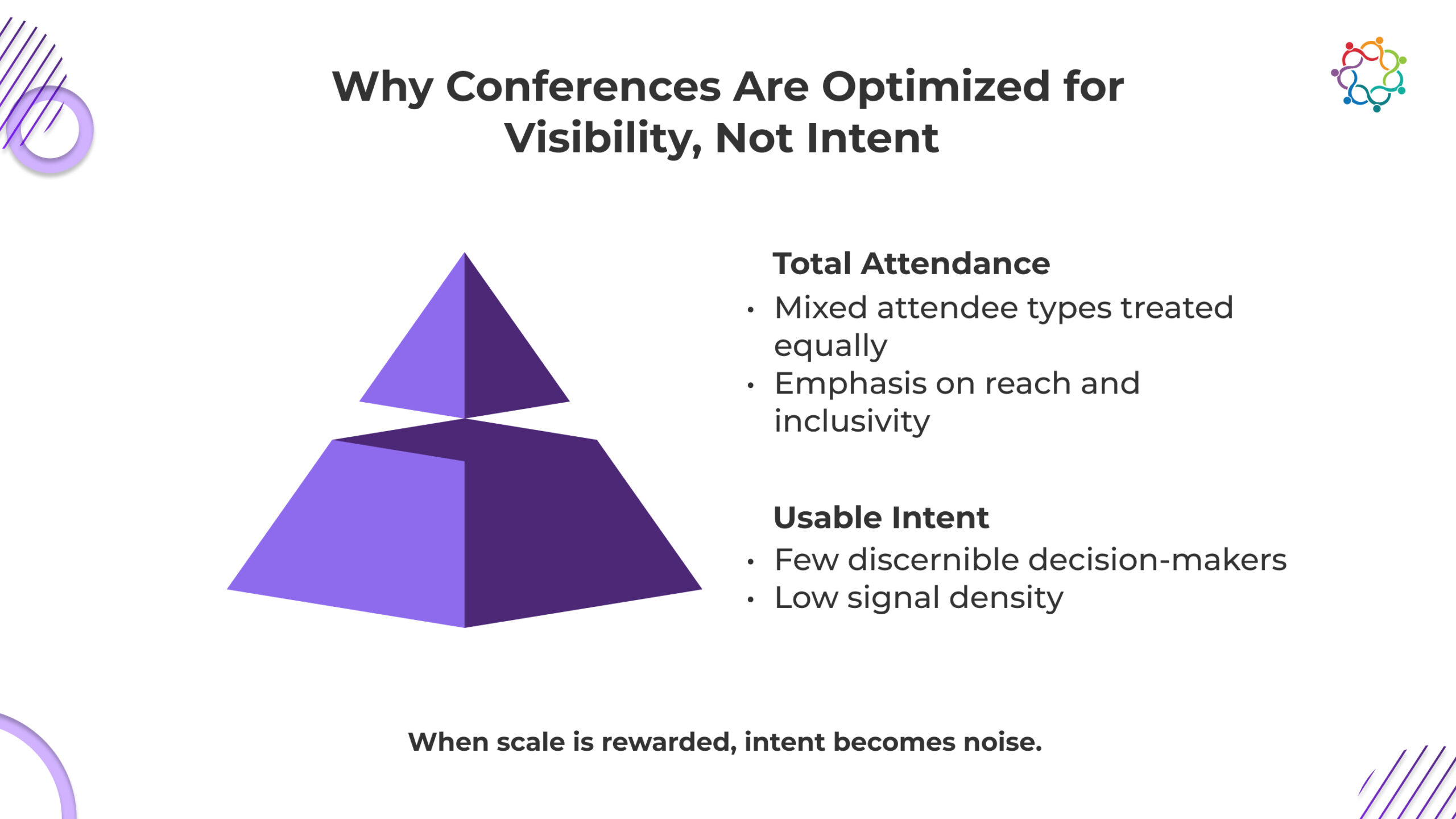 Conferences are not accidentally biased toward scale. They are built that way. Sponsors push for reach. Leadership asks for presence. Marketing reports brand amplification. Bigger audiences are celebrated, funded, and repeated. Intent density rarely appears in the approval deck. That preference shapes design decisions long before the first invitation goes out.