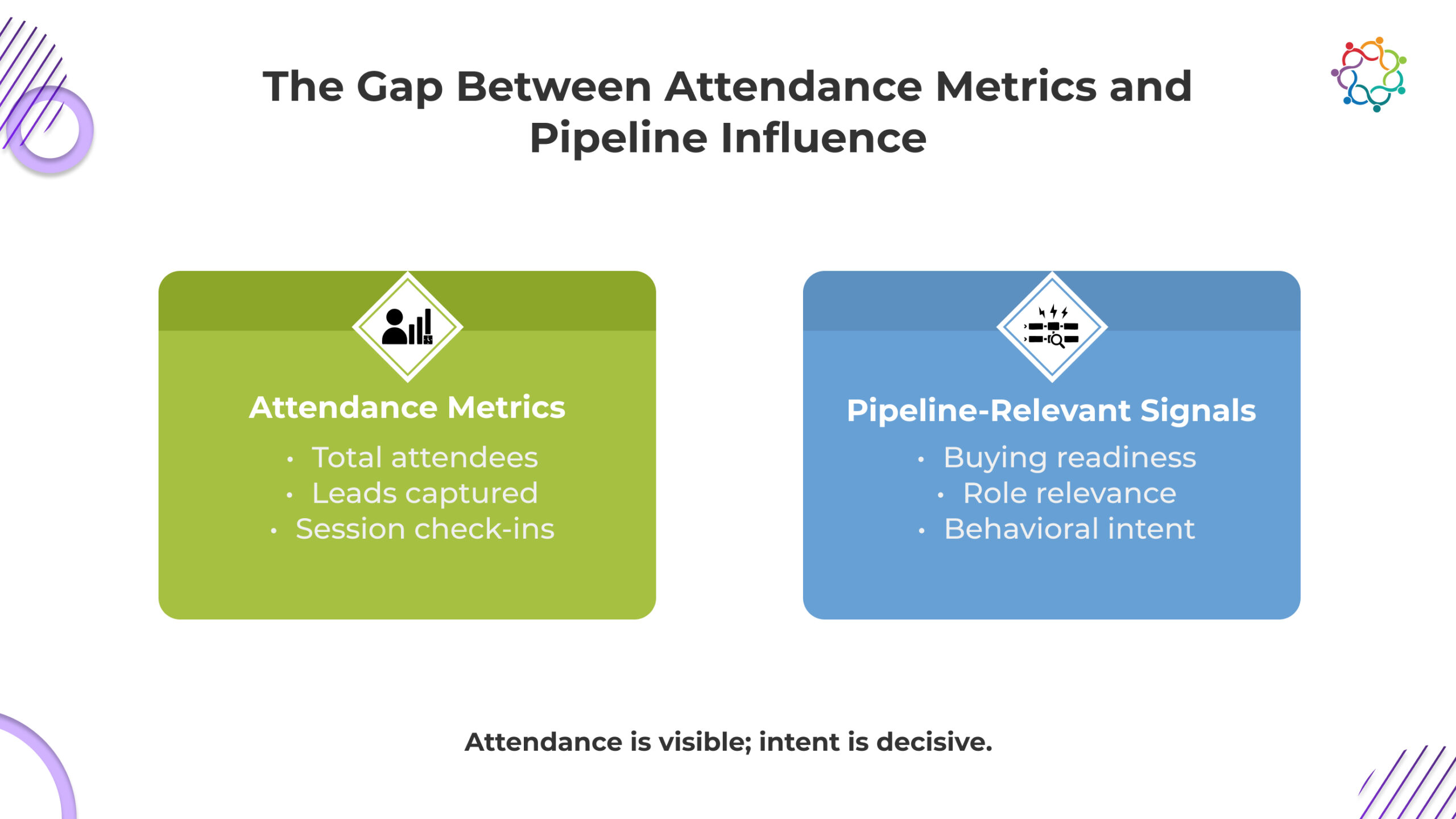 The core issue is not that attendance metrics are wrong. It is that they measure exposure, not intent. Pipeline influence depends on buying signals, decision readiness, and commercial prioritization.