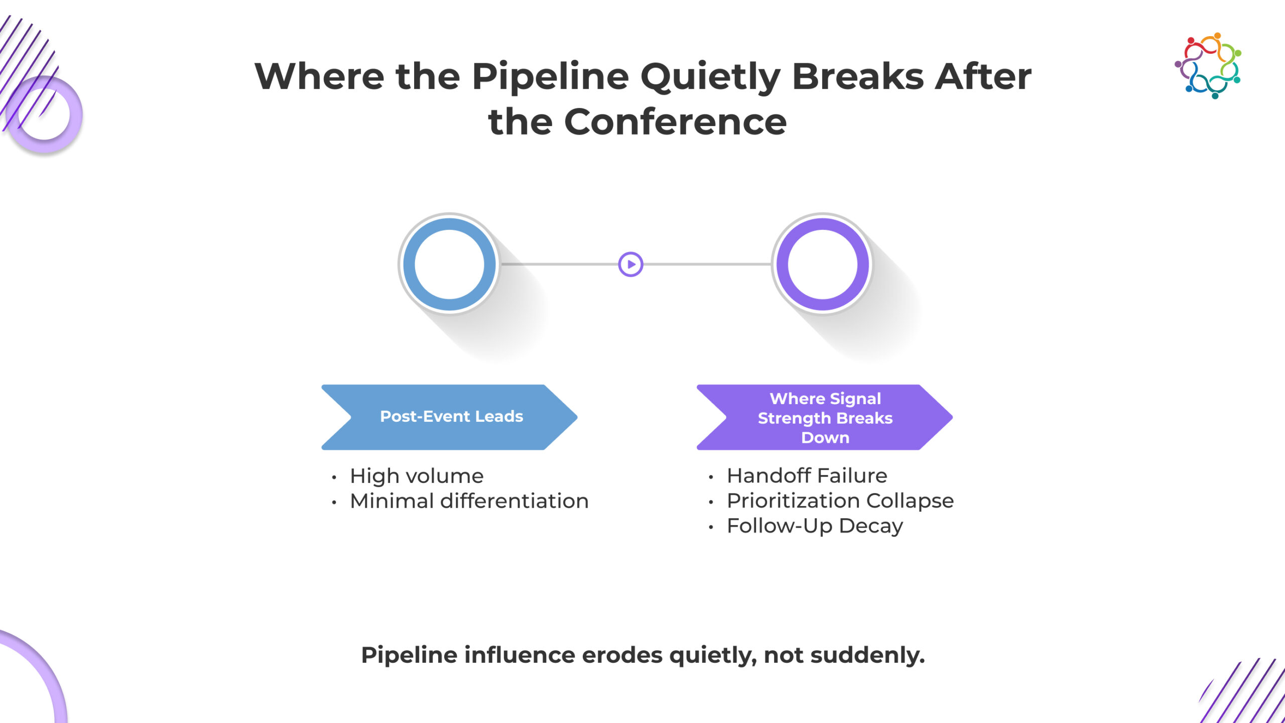 Pipeline influence is rarely absent. It is filtered out. When conferences optimize for visibility, intent clarity is traded for attendance growth. When all attendees are treated equally, lead counts rise while commercial density falls. When structured handoff and prioritization are weak, signal decays quietly inside the system.
