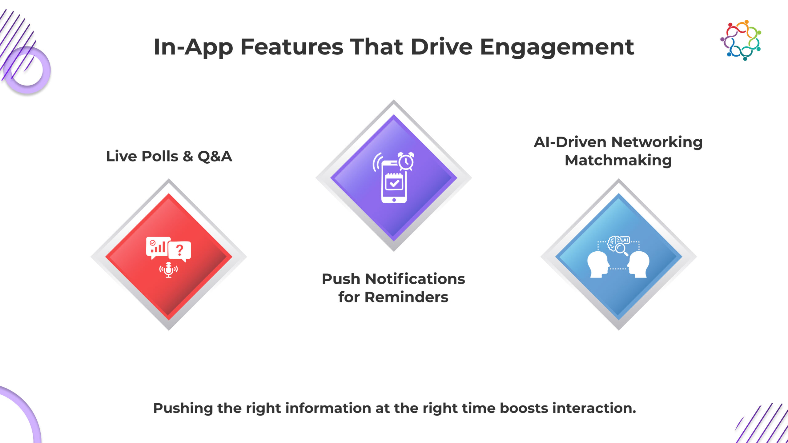 In 2026, mobile event apps are fully interactive ecosystems. They feature live polls, Q&As, networking lounges, and gamified engagement tools to keep participants active and engaged all day. Organizers use push notifications to navigate attendee flow to certain nearby sessions, announce a last-minute sponsor, or keep traffic to sponsor booths.