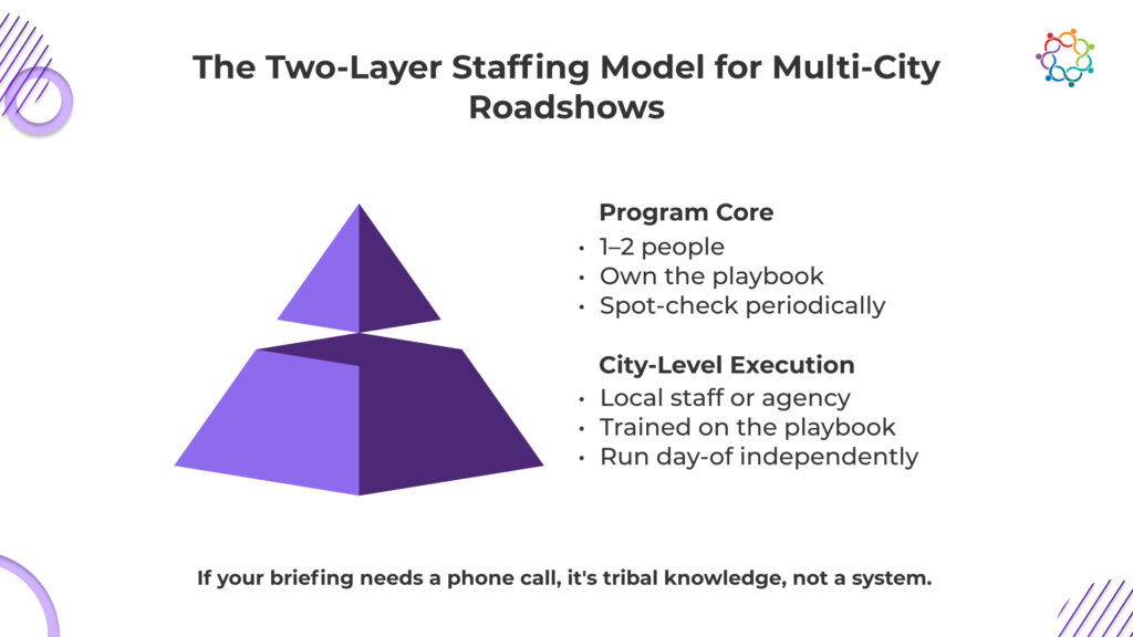 The solution is a two-layer staffing model. Layer one is the program core: one or two people who own the playbook, quality standards, and program-level decisions. They attend the first stop in every new city format and spot-check periodically. Layer two is city-level execution: local staff, agency partners, or regional sales support who are trained on the playbook and own day-of execution independently.