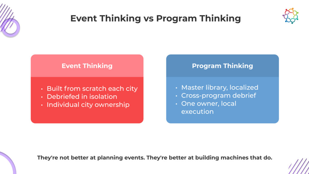 The fiftieth roadshow should feel easier than the fifth; if it does not, you built events, and you never built a program.
