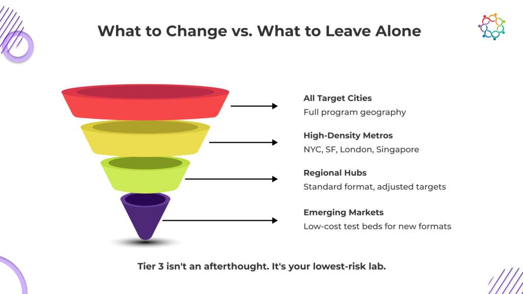 The strategic bonus of tiering: Tier three markets become low-cost test beds for new formats, topics, and speakers before you deploy them in tier one markets, where the stakes and costs are significantly higher.