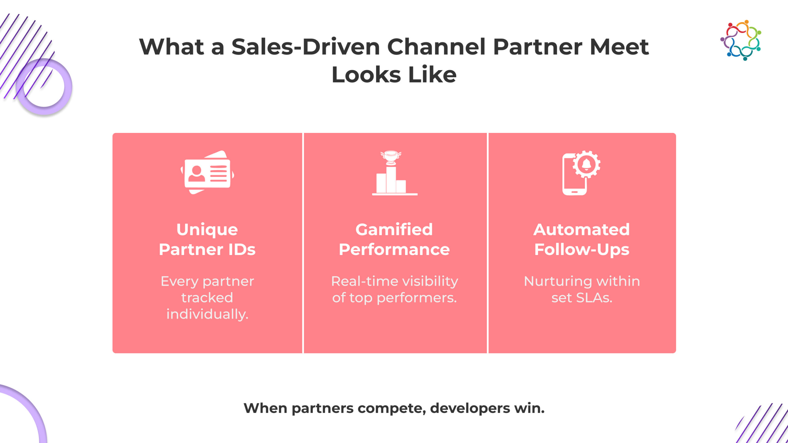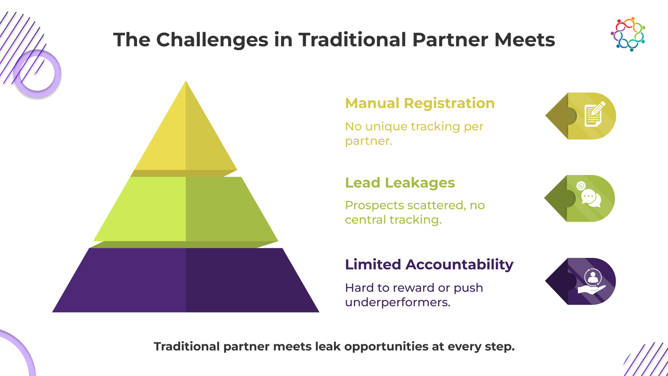 When taken all together, these precise reasons explain why ROI from partner meets is consistently. Without organization, developers cannot answer one simple question, “which partner is really moving the needle on sales?”.