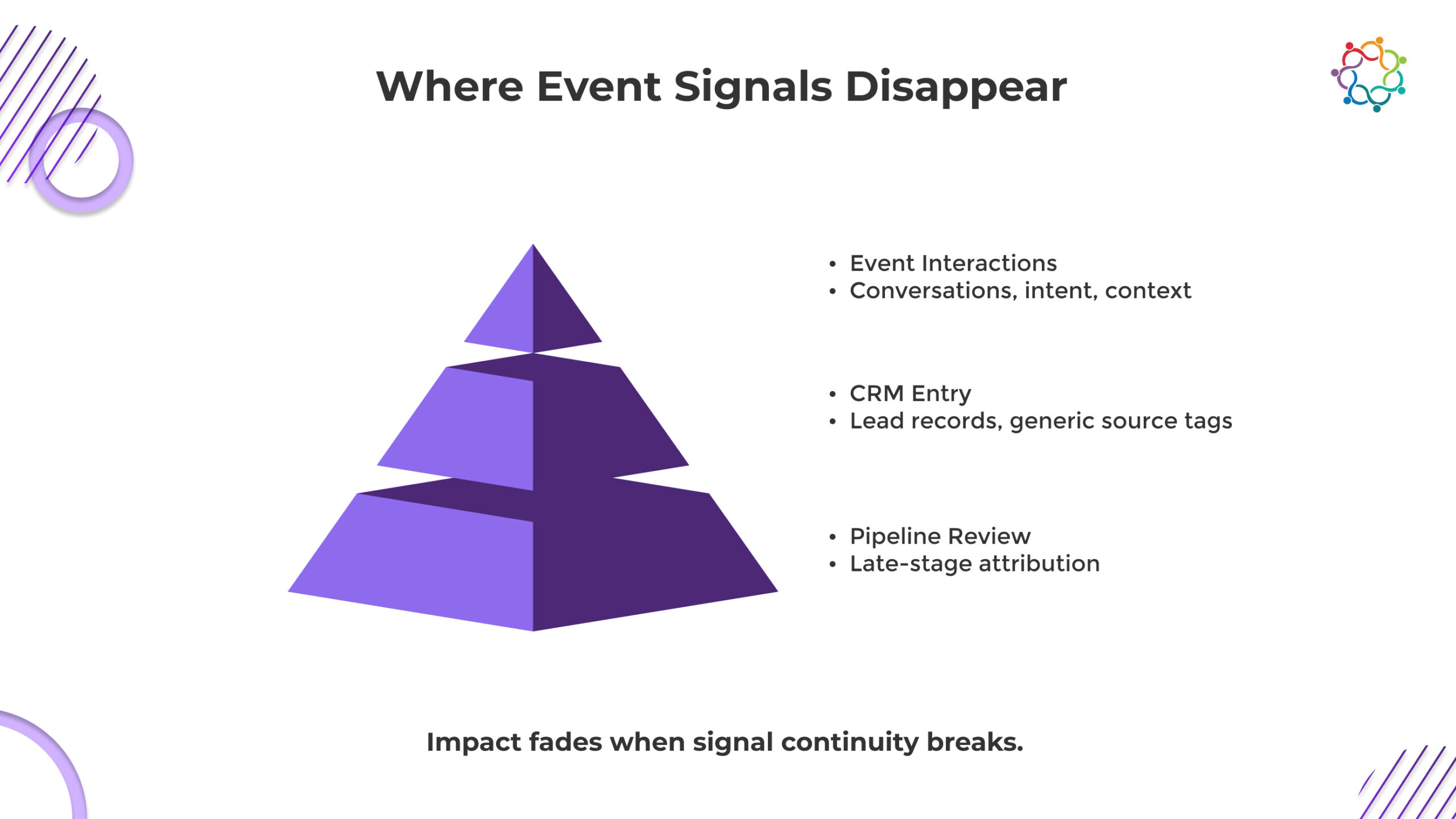 Every conversation at an activation, every demo, and every engagement produces behavioral signals: intent, interest, context, and problem recognition. These signals indicate future opportunities but rarely manifest as immediately closed deals. Event influence is diffused across time and channels, creating an attribution challenge.