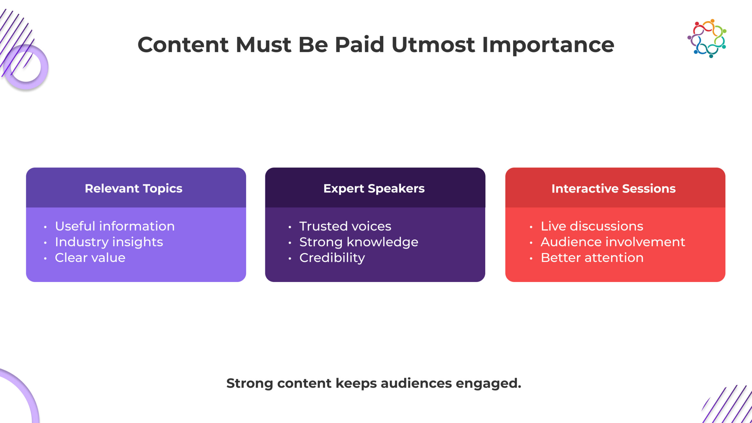 Content must be paid utmost importance whilst planning a virtual event. Unlike physical events where there’s a lot of gimmick to keep the audience engaged, Virtual Events rely on their content to keep the audience attention transfixed to the screen. It is essential to create compelling content that has value for your audience. Getting renowned speakers will be much easier given the circumstances and this will enhance the quality of the content consumed by the participants. You can also get industry experts who not only provide great insights into the industry but also engage the audience with their views on how to overcome such a crisis and what the future holds for us.