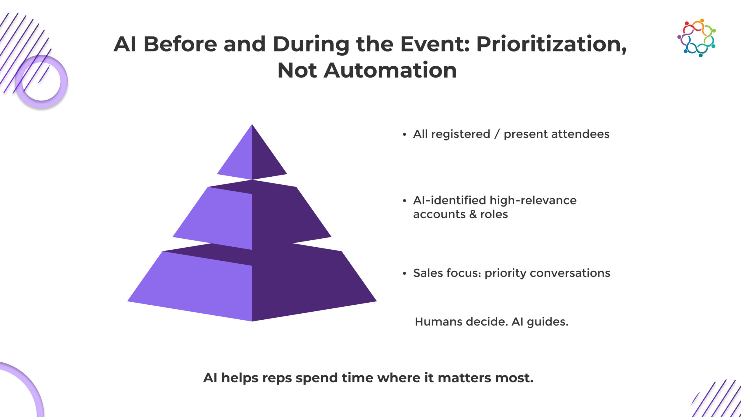 Prioritization is most important and most difficult to uphold on the event floor. Reps have to decide quickly where to spend their time as several discussions vie for their attention. AI helps make these choices without taking over.