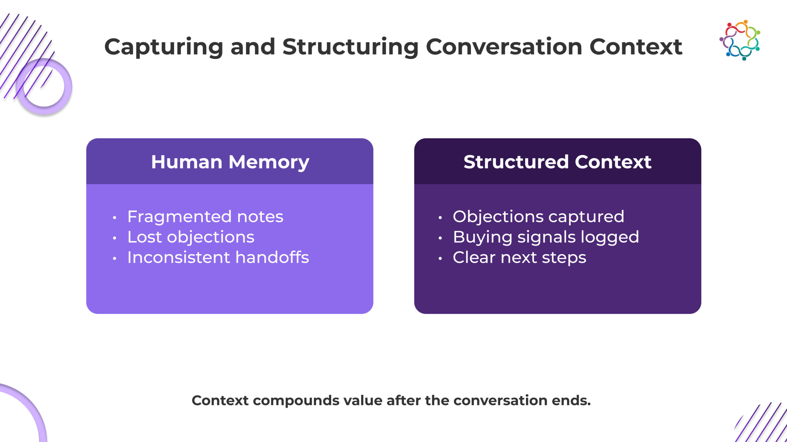Dependence on rushed post-event explanations or handwritten notes results in gaps and inconsistencies. AI assists in structuring important discussion components, such as needs, objections, and priorities, into a dependable framework that salespeople can refer to.