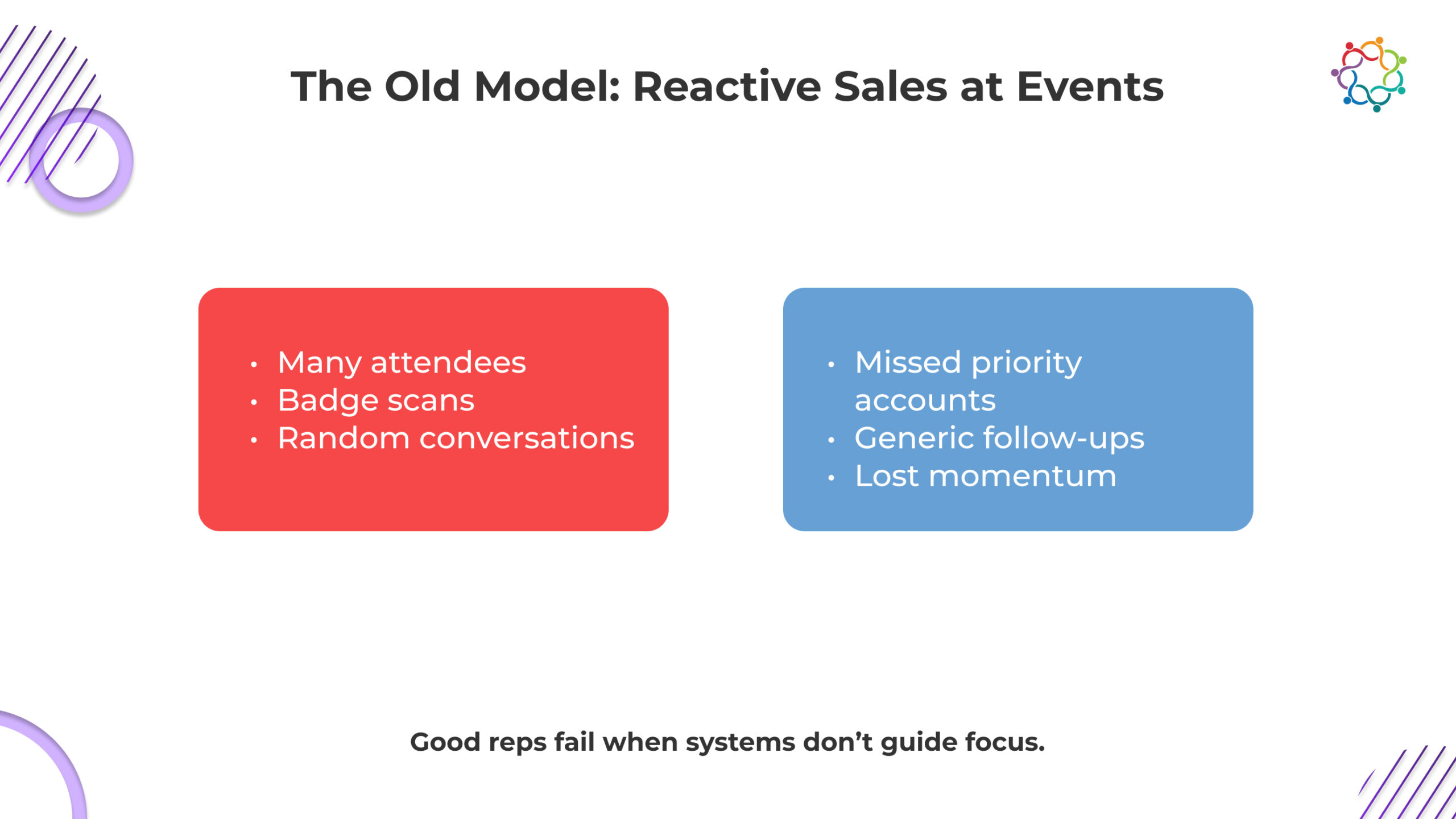 After the event, the damage compounds. Reps return to full inboxes and open deals. Event leads become just another list. Context fades, timing slips, and promising conversations go cold. Leadership then questions event ROI, mistaking a reactive system for an ineffective event.