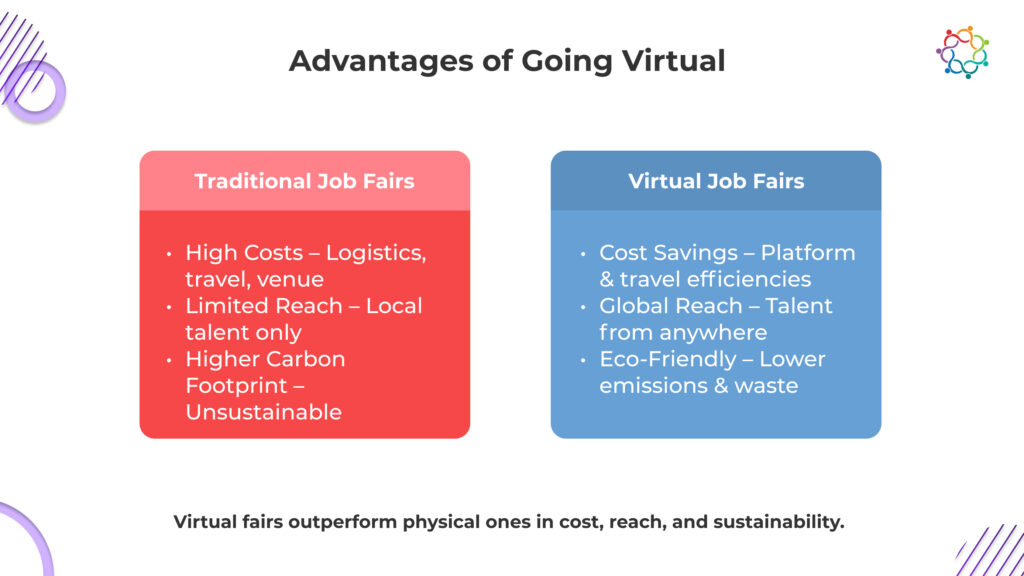 With online job fairs, organizers can afford to tighten their belts, as they can save millions of dollars, considering organizers don’t have to worry about the aforementioned factors. Also, not to mention, even participants of the event save up on travel costs, making it a win-win situation for everyone concerned.