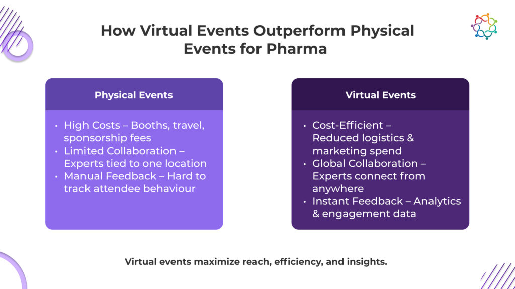 Carrying out a physical event comes with the difficulties of bringing members from across the country, or world, together under one roof. In the context of pharma companies, it is very difficult for medical experts to come together to a fixed venue for the purpose of collaboration.